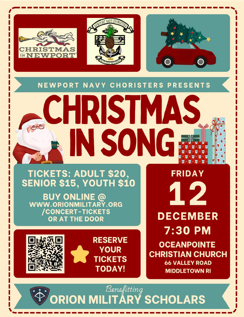 Come early and lift your holiday spirit with a joyful performance by the Newport Navy Choristers from 5:30 PM to 6:00 PM. Adding to the fun, our very own Secretary of the Board will be joining in the caroling, making this performance even more special! This incredible group has been sharing the gift of music since 1953 and is made up of active-duty and retired military members, Department of Defense employees, and their families. They have raised nearly $500,000 for charitable causes in our area, spreading cheer while giving back to the community. Their festive carols will create the perfect holiday mood as we welcome the season together.